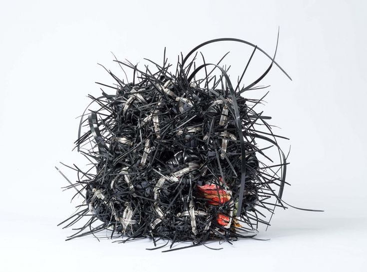 Together, these materials model how restraint moves across registers. Psychological restraint whispers through the beautifying tool; physical restraint snaps shut with hardware; social restraint threads through surfaces that script the body’s behavior. None of it is neutral. Each object carries a history of use that the sculpture refuses to launder. By keeping the mechanisms visible—teeth of a clamp, serration of a zip tie, the burn-memory of a hot comb—O’Arwisters denies the comfort of abstraction. You’re not looking at “themes”; you’re looking at instruments. Naming them is the first unbinding.