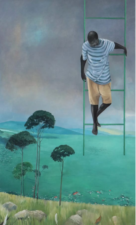 Description: This exhibition presents a new series of paintings by Nathaniel Oliver that follows a cast of characters through a single landscape over the course of a day. Drawing on his travels, personal relationships, West African material culture, and speculative fiction, Oliver crafts layered, dreamlike vignettes that explore community, survival, and the threats that hover just beyond the frame. The works unfold like a visual novella—each panel a fleeting moment in a larger, unseen narrative.